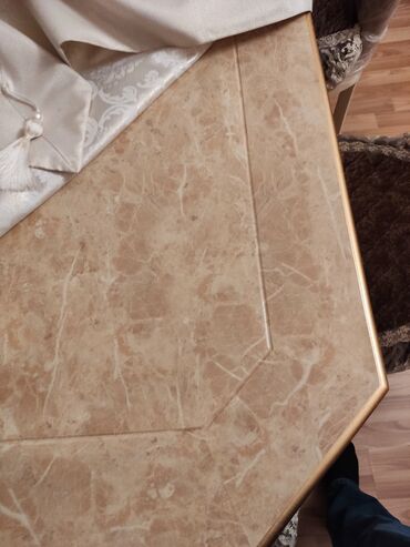- Masa: iri ölçülü, uzunsov-altıbucaqlı künclü forma; üst hissə mərmər teksturalı bərk lövhə ilə (bej/qızılı tonlarda), kənarları zərif qızılı haşiyə. Üstü üçün şəffaf masa örtüyü və naxışlı süfrə əlavə olunub.
