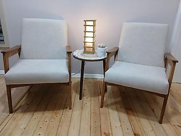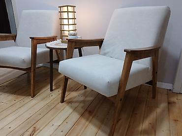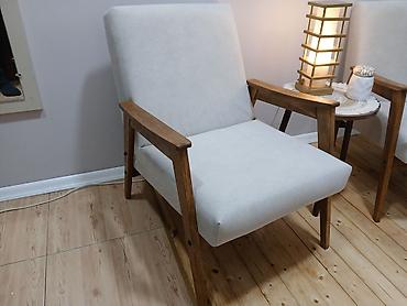 Mebel kreslosu – müasir dizaynlı, rahat oturuşlu. - Karkas: möhkəm ağac (təbii ağac fakturası). - Ayaqlar: konusvari, sabitlik verən bucaq altında yerləşdirilmiş, eyni ağac materialından. - Oturac...