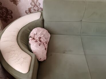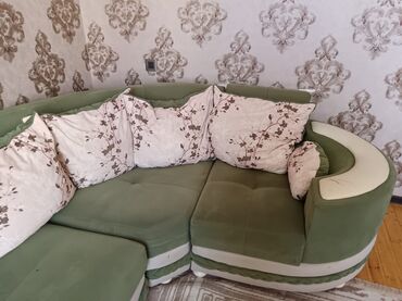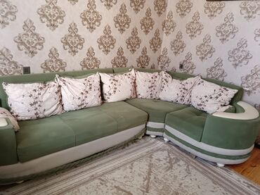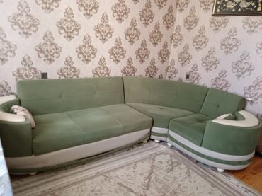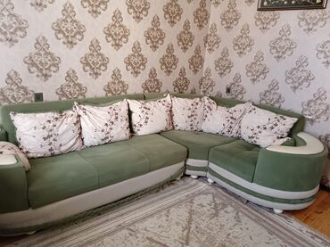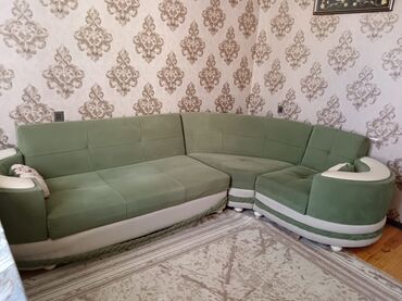 Yaşıl-krem rəng palitrasında L formalı künc divan dəsti.