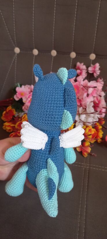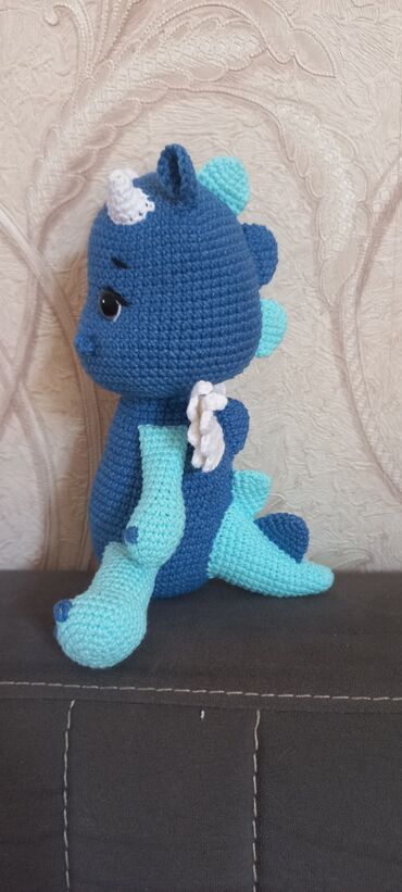 Əllə toxunmuş amigurumi ejderha oyuncağı - Material: yumşaq pambıq iplik, təhlükəsiz bərkidilən plastik gözlər - Rənglər: tünd mavi gövdə, açıq mavi əllər/ayaqlar və quyruq çıxıntıları, ağ balaca ...