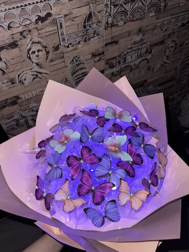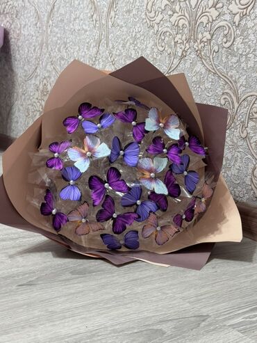 - Dekorativ buke kompozisiyası: şəffaf dekor toru üzərində çoxsaylı 3D kəpənək fiqurları (bənövşəyi, lilac və pastel tonlarda), mərkəzdə incə mirvari bəzəkləri.