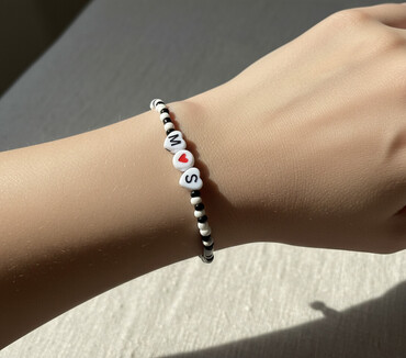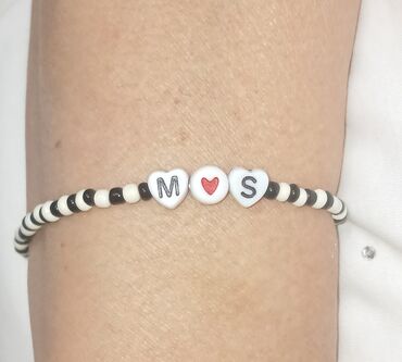 EndirimsizQara-ağ boncuklu elastik bilərzik. Mərkəzdə üç dekorativ hissə: iki ürək formasında ağ boncuk üzərində “M” və “S” hərfləri, ortada isə qırmızı ürək simvolu olan dairəvi ağ boncuk. Kənarlarda növbəli şəkildə düzülmüş kiçik qara və ağ silindrik boncuklar minimalist və zərif görünüş yaradır. Elastik iplik sayəsində biləyə asanlıqla taxılıb çıxarılır və müxtəlif ölçülərə uyğunlaşır. Gündəlik istifadə və hədiyyəlik personalizə edilmiş aksesuar kimi idealdır.