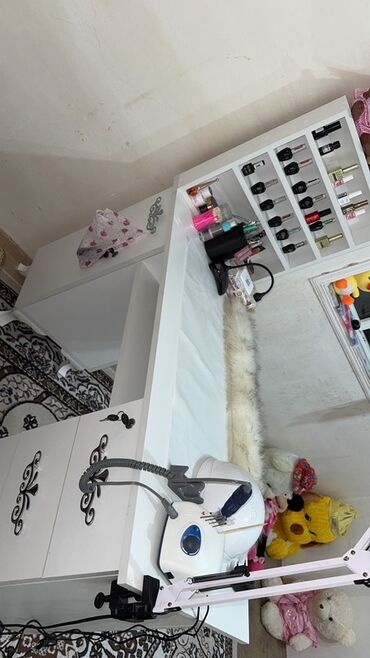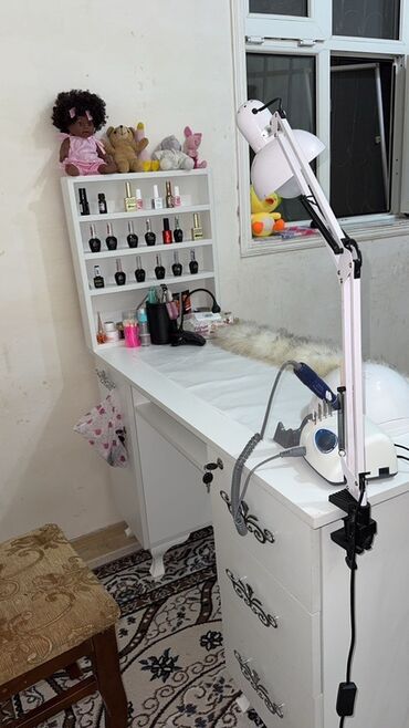 - Ağ rəngdə funksional manikür masası: geniş iş səthi, kilidli şkaf və 3 çekmece, dekorativ tutacaqlar, yan tərəfdə dəsmal asacağı.