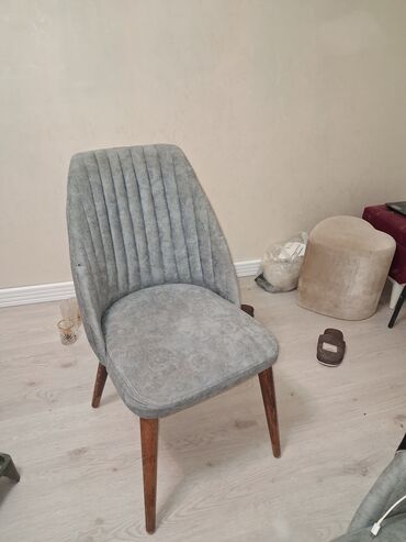 - Stul: yumşaq oturacaq və bel hissəsi; şaquli tikişli arxa dayaq; parça örtük; taxta ayaqlar.