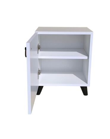 Ağ rəngli komod/çarpayı yanı tumba - Minimalist dizayn, müasir interyerlərlə uyumlu - Material: laminat/MDFlam gövdə - 2 açıq rəf: üst hissə jurnallar, planşet və xırda əşyalar üçün; alt hissə kit...