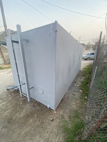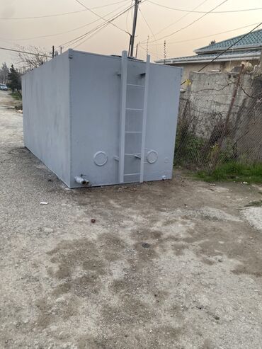 Metall yanacaq/su çəni - Material: qalın divarlı polad - Forma: düzbucaqlı, horizontal yerləşmə - Təxmini ölçülər: uzunluq ~2.5–3 m, hündürlük ~1.6–1.8 m, en ~1.2–1.4 m - Üst hissədə baxış qapağı/...