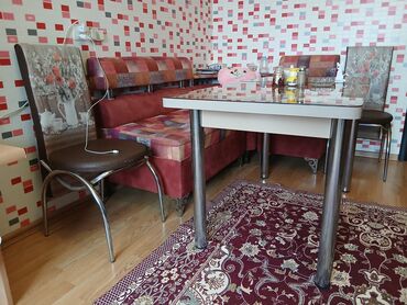- Künc divan: L formalı, yumşaq oturacaq və bel hissəsi, mozaik rəngli parça üzlük. Aşağıda metal dayaqlar.