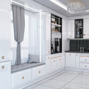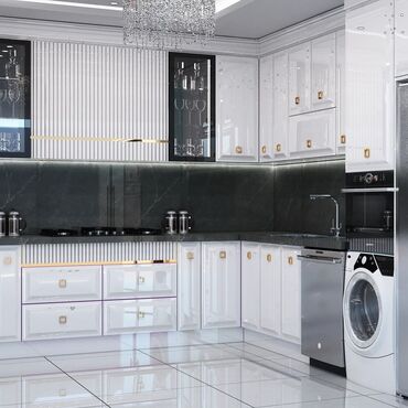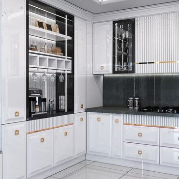 - Dizayn: L formalı, yüksək parlaq ağ fasadlar, qara şüşə vitrin panelləri və qızılı kvadrat tutacaqlar. Dekorativ şaquli rellef panellər və nazik qızılı-yaradıcı xətt detalları ilə zərif görünüş.