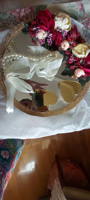- Güzgülü xonça: dairəvi forma, kənarı qızılı muncuq və rhinestone bəzəklərlə işlənib. Üst hissədə qırmızı, krem və çəhrayı tonlarında süni güllər kompozisiyası, yaşıl yarpaqlar və kiçik dekorlar. Ağ atlas lent və iri inci detallı bəzək mövcuddur. Üzərində iki ədəd qızılı ürək formalı kiçik qutu/stand var (kənarları daşlı).