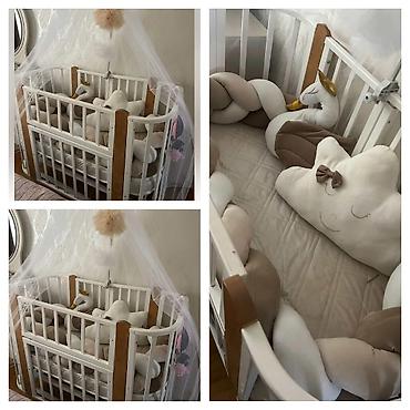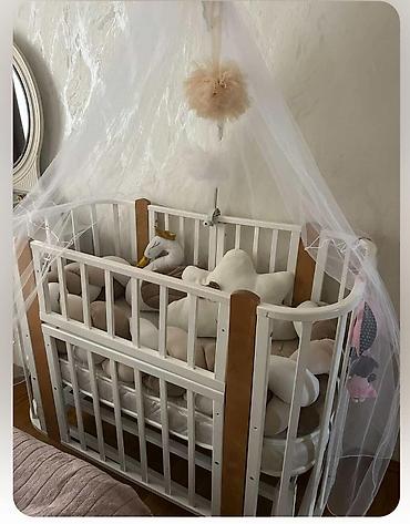 Milana…Transformer beşik 130man balaca/böyük etmek olur. Hündürlüyü də tenzımlenır. Uşaq kravatda yatmır yer yoxdu deye satılır. Ön hissesi çıxarılır ana yanı edilir, yellenir. Matras , Bortık ve tül uzerinde verilir.