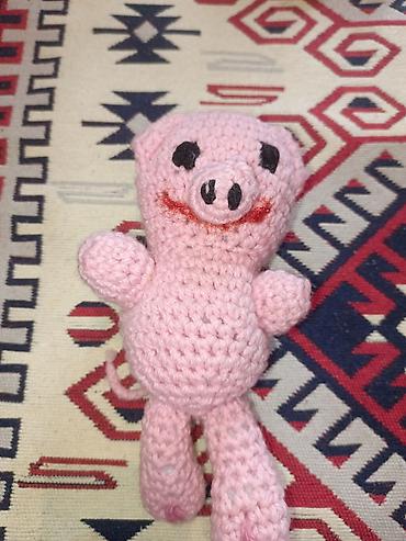 - Çəhrayı donuzcuqda çıxıntılı burun, qara sapla işlənmiş göz və burun dəlikləri, ağız hissəsi qırmızı sapla tikilib, arxada nazik quyruq.