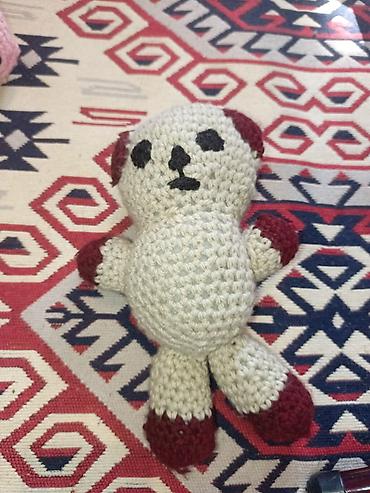 - Krem rəngli oyuncaqda bordo rəngli qulaq və pəncə ucları, qara sapla işlənmiş göz-burun-ağız.