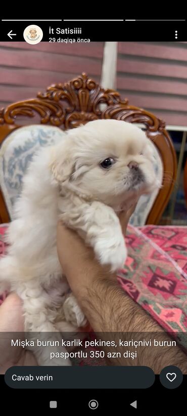 Növ: Pekinges (karlik/mini). Peyvənd vurulub, qurd dərmanı verilib, biti biresi yoxdur. istenilen yerde yoxlatdirila biler 2 aylıqdır üstündə hər birşeyi veriləcək qabi 15 manatliq şampunu, yemey qabi, daşıma qabi, pedleri, tasmasi falan her bir şeyi veriləcək üstündə