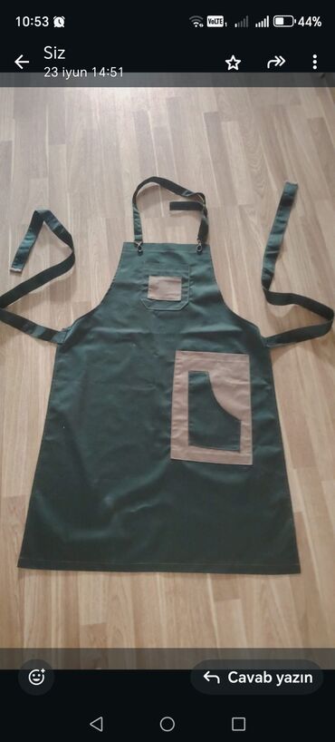 - Önük (fartuk): Tünd yaşıl rəng, tənzimlənən boyun qayışı və uzun bel bağları. Üstdə kiçik, aşağıda böyük bej rəngli ciblər – alətlər, bloknot və ya aksesuarlar üçün rahat saxlama. Dayanıqlı parça.