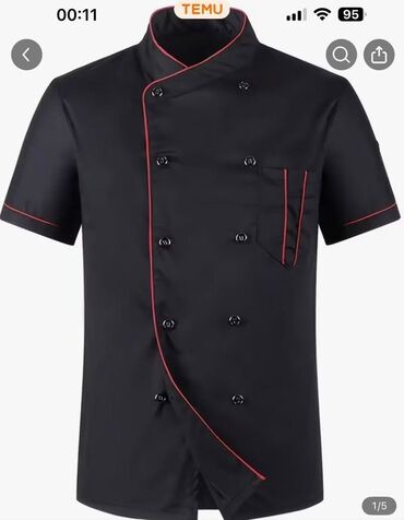 - Aşpaz köynəyi: Qara rəng, qısaqol, ikiqat döşlü (double‑breasted) model. Qırmızı kant tikişləri, yan cibdə dekorativ qırmızı xəttlər, mandarin yaxa. Mətbəx üçün praktik və səliqəli görünüş.
