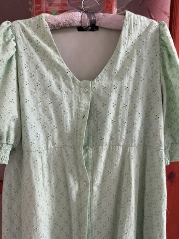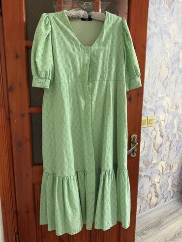 Yazlıq/xanım paltarı – açıq yaşıl rəngdə, kvadrat yaxalı. - Model: A-kəsimli, aşağı hissədə ikiqat büzgülü ətək. - Qol: Həcmli “puff” qollar, əlavə nazik tənzimlənən askılar. - Uzunluq: Dizdən bir ...