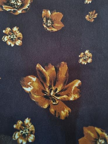 Ölçü etiketində: REMODA. Çiçək naxışının yaxın planı şəkillərdə təqdim edilib. Şıq çanta və zərif sırğalarla asanlıqla kombinlənir.