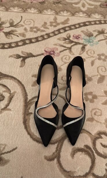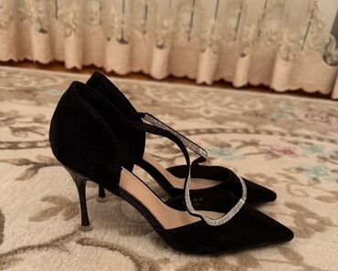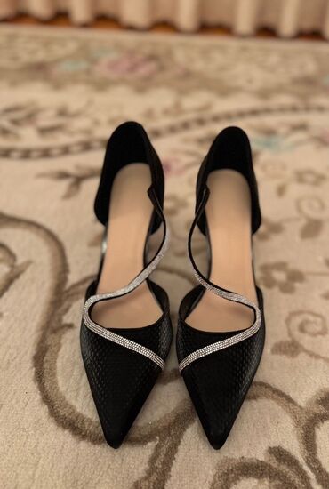 Qadın üçün elegan gecə ayaqqabısı 40 razmer - Rəng: qara (üst hissə), gümüşü detallarla - Model: sivri burunlu, açıq dabanlı, nazik daban (təxminən 8–10 sm) - Material hissi: zərif süet görünüşlü ...