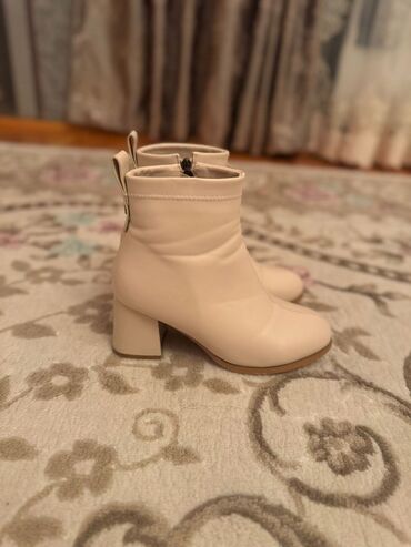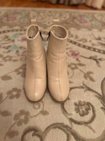 Bej rəngli qadın çəkmələri - Model: qısa boğazlı, chunky dizayn - Material: parlaq dərimsi üstlük, iç hissə tüklü/isti astarlı - Bağlanma: yan tərəfdə rahat metal fermuar - Aşağılıq: qalın, relyef...
