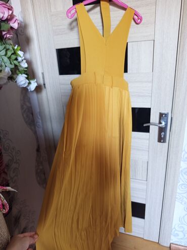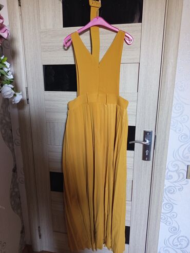 YeniQadın paltarı – xardal sarı rəngdə, uzun, pliseli ətəkli model.