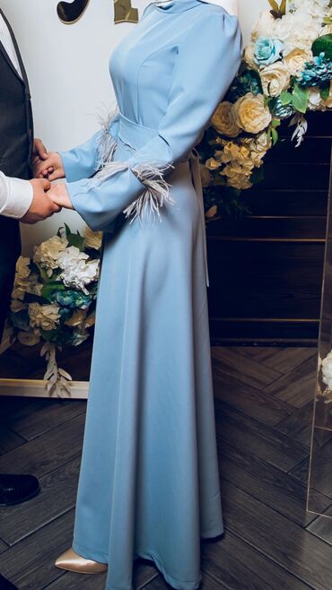 Məhsul: Zərif ziyafət/nişan/gecə geyimi - Rəng: Açıq mavi (pastel ton) - Model: Uzun, ətəyi bol axıcı kəsim - Parça: Yüngül, dalğalı düşüşlü şifon tipli ətək; üst hissə dekorativ parça ilə işlənmi...