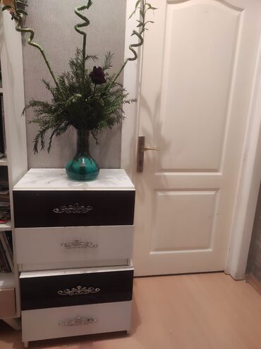 Komod – 4 çekmecəli, ağ-qəhvəyi rəng kombinasiya, metal naxışlı tutacaqlar, ağ dekorativ ayaqlar. Ölçülər: hündürlük 1 m, en 80 sm, dərinlik 40 sm. Material: taxta fakturalı lövhə, hamar ön panellə...