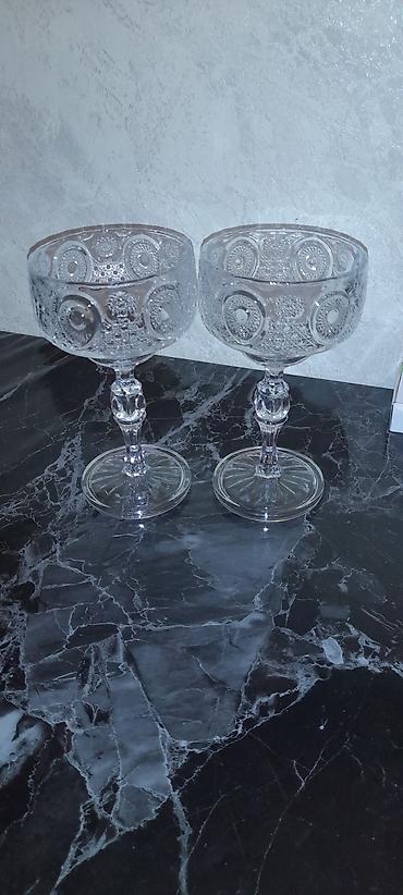 Şüşə qədəh və karaf dəsti - 5 ədəd ayaqlı şampan/kokteyl kupları: şəffaf şüşədən, ətrafı oyma naxışlı (gül və həndəsi motivlər), klassik qısa ayaqlı forma. Servis və desertlər (mousse, dondurma) ü...