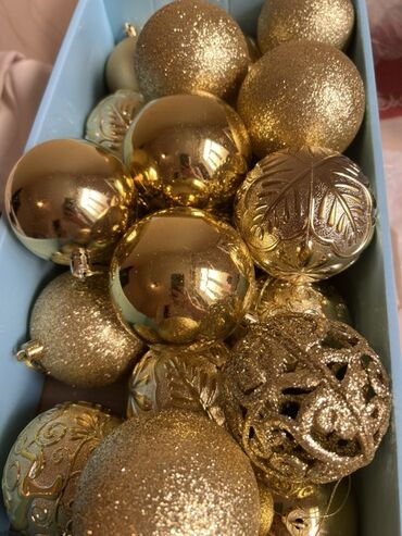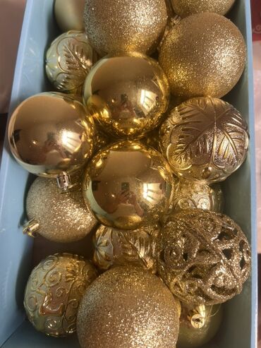 Yeni il ağacı bəzəkləri dəsti - Müxtəlif formalı və rəngli bəzəklər: klassik kürəciklər, uzunsov parıltılı oyuncaqlar, üst bəzəyi üçün qızılı tel ulduz. - Rənglər: qızılı, gümüşü, mavi, yaşıl, qır...
