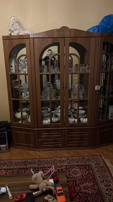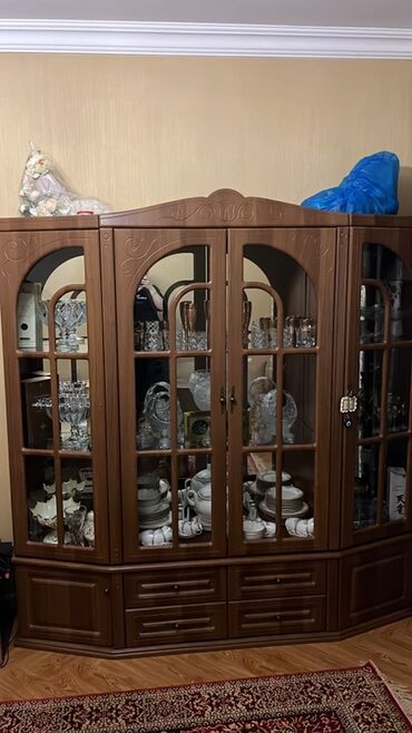 3) Buxara/vitrin şkafı: çoxseksiyalı, şüşə qapılı vitrinlər, içəridə rəflər; aşağı hissədə çekmecələr. Yemək dəsti, kristal və dekorların sərgilənməsi üçün nəzərdə tutulub.