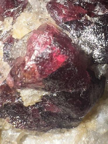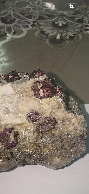 - Tərkib: Açıq-bej rəngli ana süxur daxilində iri, parlaq bordo-qırmızı kristal yığınları (şərab rənginə yaxın tonlar). Səthdə yarı‑şəffaf parıltı və zəngin rəng zonaları görünür.