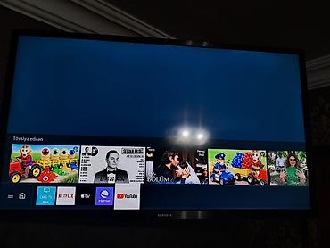 - Smart TV funksiyaları: əsas tətbiqlər menyusunda Netflix, YouTube, Apple TV, İnternet (veb-brauzer), Canlı TV bölməsi və tövsiyə paneli görünür