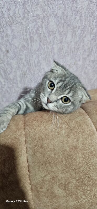 Şotland qıvrımqulaq (Scottish Fold) pişiyi - Rəng: Boz-gümüş tabby, yumşaq qısa tüklü - Qulaqlar: Klassik qıvrılmış, başa yaxın - Gözlər: Sarı-qızılı, ifadəli - Xüsusiyyətlər: Sakit və mehriban xa...
