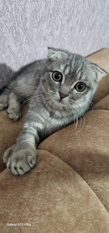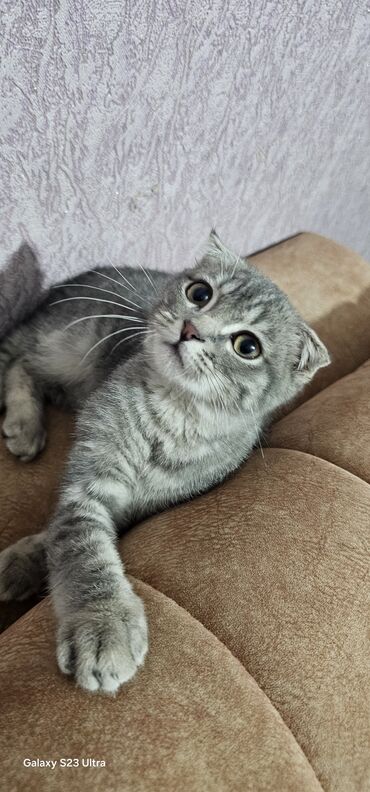 Şotland qıvrımqulaq (Scottish Fold) pişiyi - Rəng: gümüşü-boz tünd zolaqlı (tabby), bədən və qarında ləkəli/zolaqlı naxış - Qulaqlar: tipik “fold” – önə doğru qatlanmış - Gözlər: iri, kəhrəba rəng...