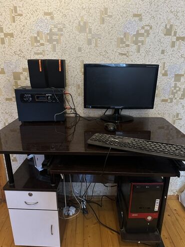 - Kompüter masası: tünd rəng, sürüşən klaviatura rəfi, sistem bloku üçün yan bölmə, alt hissədə 2 çekmecə.