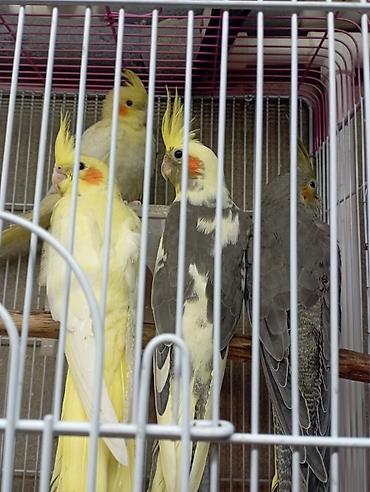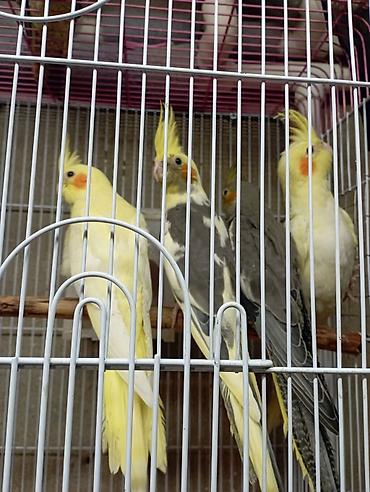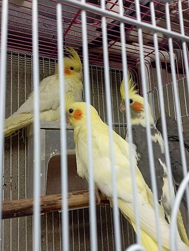karella korella erkey disi hazir quşlar - Növ: Nymph paraket (cockatiel), başda sarı çəlpik, yanaqlarda narıncı ləkələr - Rənglər: boz-ağ qarışıq, sarı quyruqlu və ağ-qara variasiyalar - Qəfəsdə ...