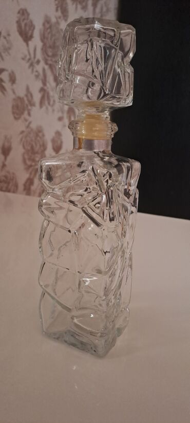 Büllur dekanter - Material: qalın, şəffaf büllur/şüşə - Forma: kvadrat gövdə, kəsikli və relyefli naxışlar; üst hissədə geniş kvadrat qapaq (stopper) - Dizayn: gövdənin ortasında rombvari tekstu...