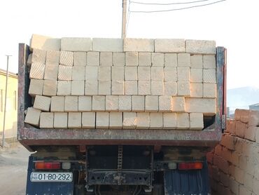 Təbii daş (daş karxanası məhsulu) – tikinti üçün kubik/kərpic bloklar - Material: təbii daş, sıx və möhkəm quruluşlu - Rəng: açıq sarı-bej tonları - Ölçü və forma: düzbucaqlı kəsim, hörgü üçün əlv...
