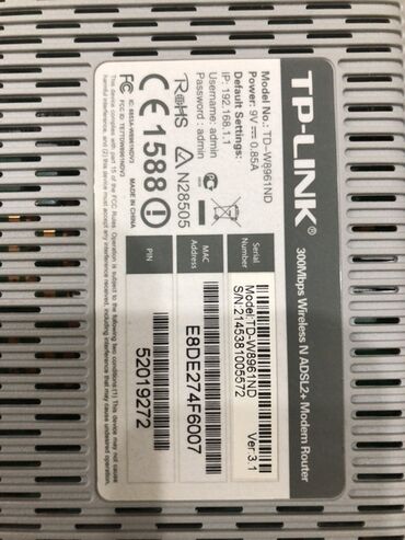 Başlıq: Modem Təsvir: TP-Link TD-W8961N ADSL2+ modem/router. - Simsiz sürət: 300 Mbps (2.4 GHz) - Daxili ADSL modem + Wi‑Fi router funksiyası - 2 ədəd çıxarıla bilən anten - 4x LAN port (Ethernet...