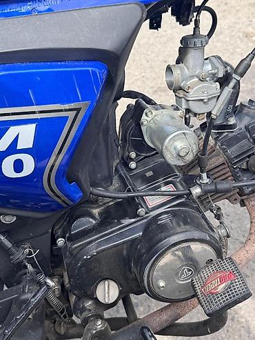 Tufan M50 motosiklet - Mühərrik: 80 sm³, karbüratorlu, əl ilə sürət dəyişmə (ayaq pedalı). - Yanacaq sistemi: xarici yanacaq filtri quraşdırılıb, karbürator və hava filtri görünür. - Təkərlər:...