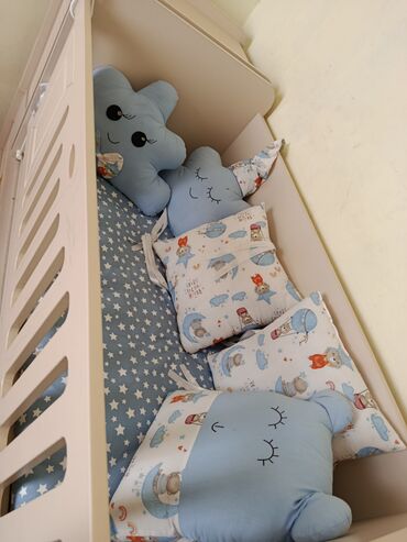 - Dəstlə birlikdə tekstil paketi: ulduz naxışlı komplekt, yan qoruyucu yumşaq bortlar, yastıq, yorğan üzü; əlavə olaraq şirin fiqurlu dekorativ yastıqlar