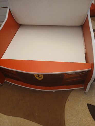 Uşaq üçün maşın formalı çarpayı - Rəng: qırmızı, kapot və faraları təqlid edən ön panel - Yanlarda təkər forması, aerodinamik gövdə dizaynı - Başlıq hissəsində nömrə nişanı üslubunda dekor - Ön hi...