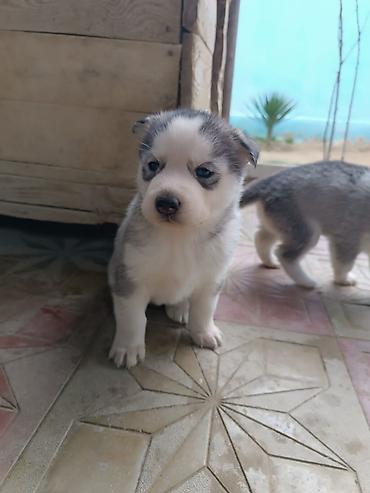 Sibir Husky balası – boz-ağ rəngli, mavi gözlü. Xüsusiyyətlər: - Cins: Sibir Husky (Husky) - Rəng: boz-ağ, üzündə tipik qara-ağ maska - Gözlər: açıq mavi - Qulaqlar: dik, iti formalı - Xəz: qalın,...