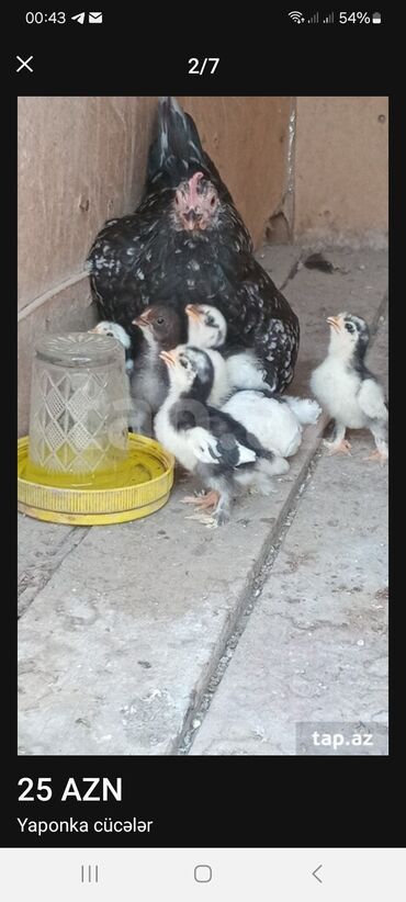 Yaponka cuceleri var satiwda3. 4 gunlukduler yumurta wekeryemle mayalandirmiwam 1 hefteye qeder 3 manat 15 gunluk 4 manat. 1 aylig 5 manat hal hazirda 14 dene var cuce satiwda.kim istese buyursun ata analarida var wekili hamisi cildiler ayagi bol tukludu yalandan tuk deyil.bakidadi oz heyvanlarimdi buyurun.tek xoruzda var damazdig 3 yawi var tumunada soz yoxdu 15 yumurtadan 14 cuce cixib bu il .