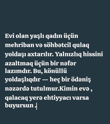 Ev şəraitində yaşlı yataq xəstəsinə (kişi) qulluq etmək üçün gündüz və axşam növbəsinə təcrübəli xanım baxıcılar tələb olunur. İş gündüz növbəsi hər gün səhər 09:00-dan 19:00-dək, axşam növbəsi saa...