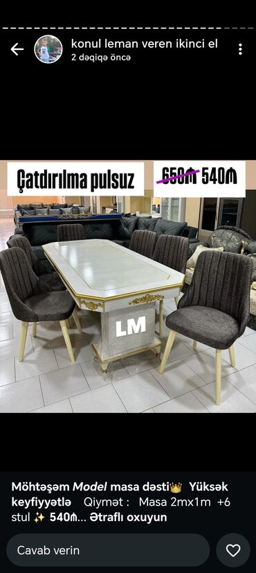 - Yemək masası dəsti: 1 ədəd düzbucaqlı masa (təxminən 2 m x 1 m) və 6 ədəd yumşaq oturacaqlı stul. Ağ-sarı-qızılı dekorlu, qalın üst səth, bəzəkli alt baza. Qiymət: 540₼ (650₼ üzərindən). Çatdırılma pulsuz.