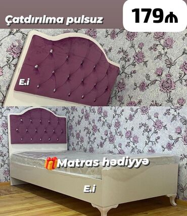 - Tək nəfərlik çarpayı (açıq krem gövdə, bənövşəyi tufte başlıq): matras hədiyyə. Qiymət: 179₼. Çatdırılma pulsuz.