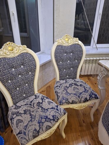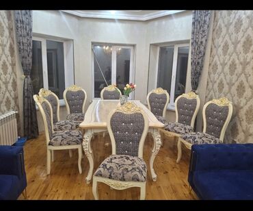Dəst, geniş ailə süfrələri və qonaqlıqlar üçün ideal oturma komfortu və estetik təqdim edir. Oyma detallar və parça seçimi məkanı daha zərif göstərir.