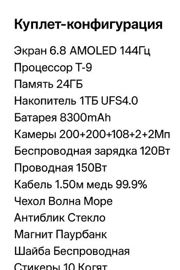 Yüksək tezlikli AMOLED ekran, böyük 8300 mAh batareya və 24 GB RAM sayəsində güclü performans. 200 MP-lik çoxkameralı sistem yüksək detallı foto və video çəkiliş imkanı verir. 1 TB UFS 4.0 yaddaş sürətli fayl ötürməsini təmin edir. Paketdə əlavə aksessuarlar daxil edilib.