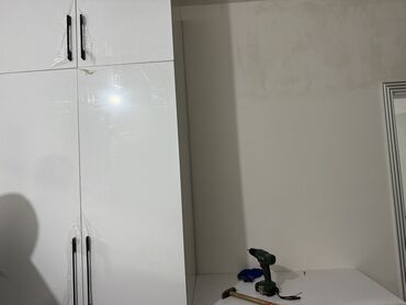 Ağ rəngli, minimalist dizaynlı qapalı dolab və iş/komod bloku dəsti.