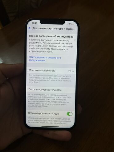 Bu, Apple iPhone 12 Pro Max modelidir. Qara rəngdədir və arxa tərəfində üç kamera sistemi, həmçinin LiDAR skaneri mövcuddur. Cihazın ekranında vaxt və tarix görünür, istifadəçi interfeysi iOS əməliyyat sisteminə xasdır. Telefonun batareya sağlamlığı 70% təşkil edir. Bu model Face ID təhlükəsizlik xüsusiyyətinə, Super Retina XDR ekrana, A14 Bionic çipə və 5G şəbəkə dəstəyinə malikdir. Cihazın kənarlarında yüngül kosmetik izlər müşahidə olunur.